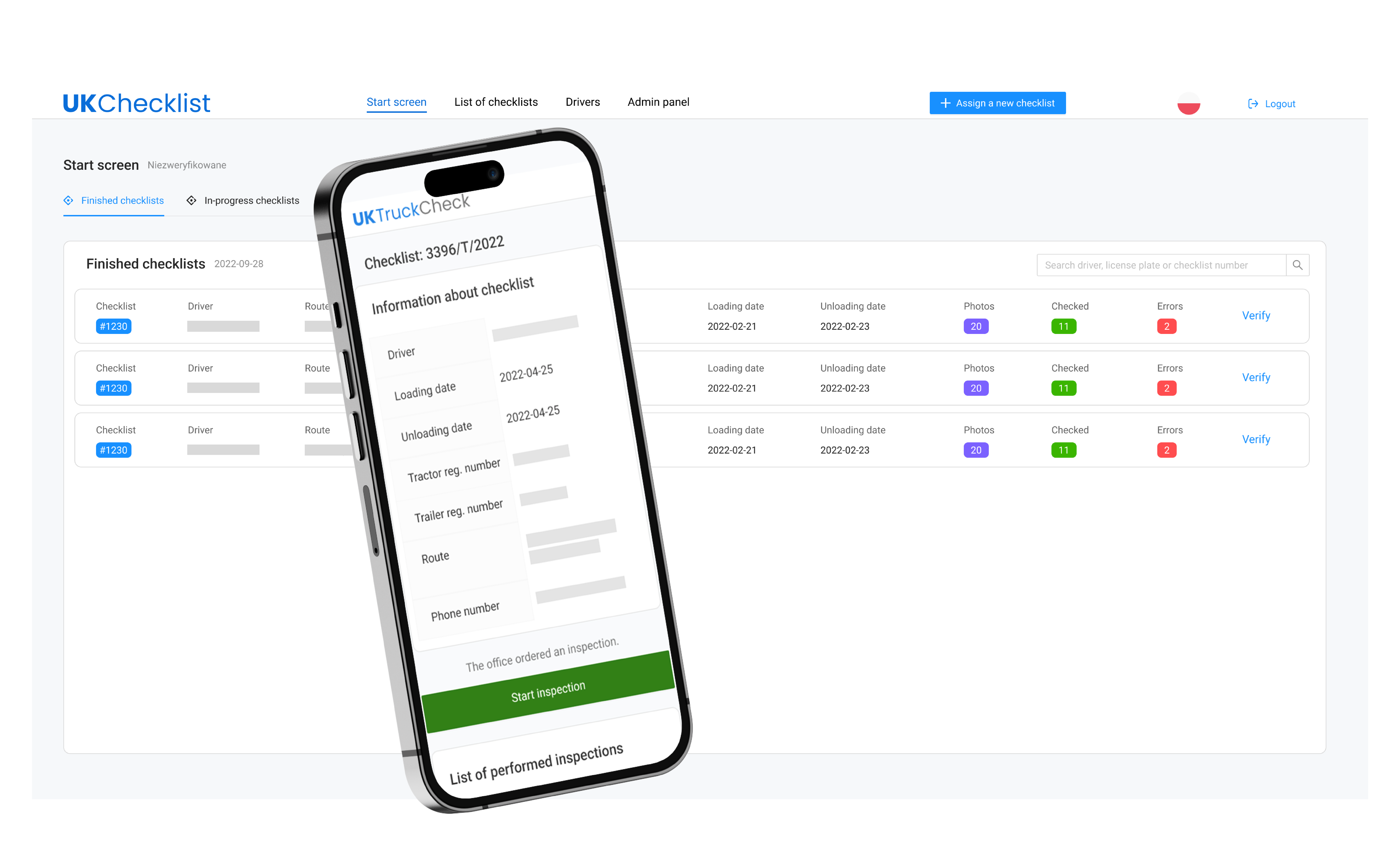 Enter the relevant information and assign a checklist. The system will automatically send a link to the checklist to the phone number assigned to the driver.